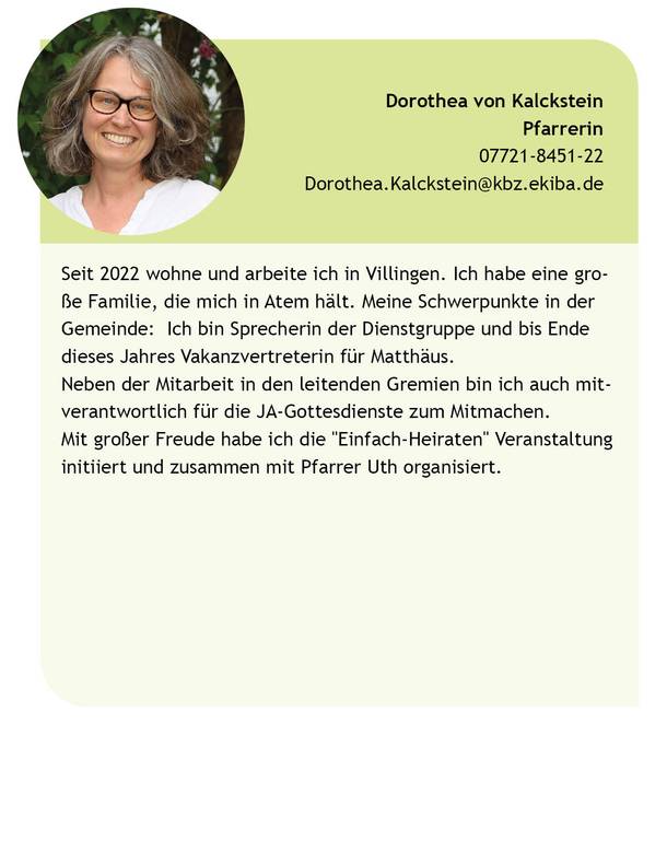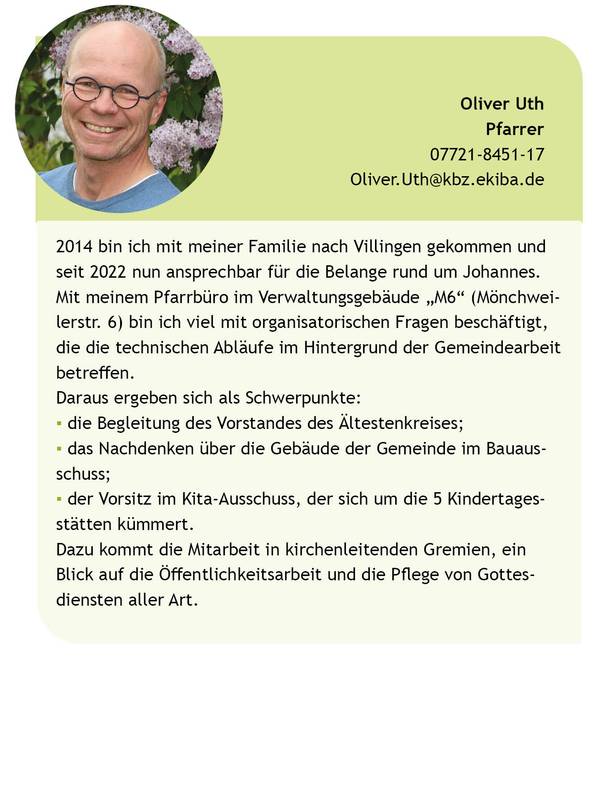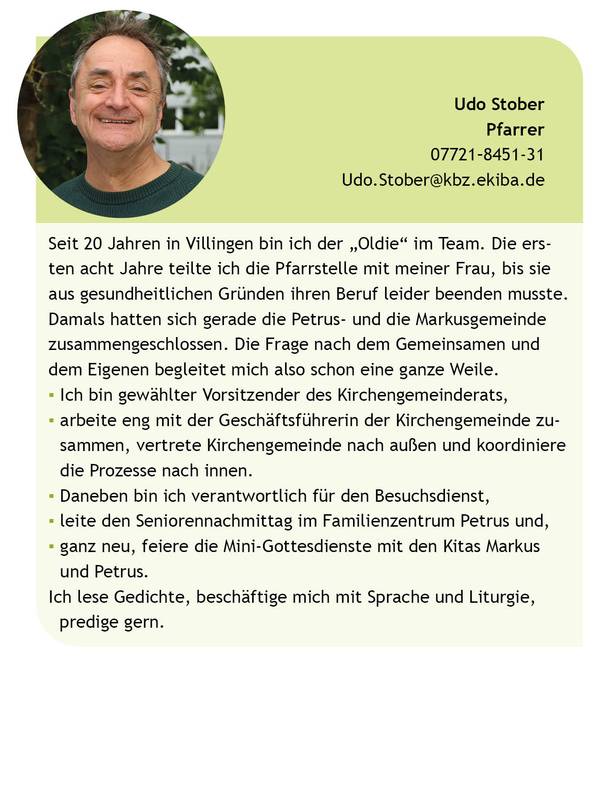 Wir sind ein Team und gestalten die Gemeindearbeit in der Kirchengemeinde Villingen gemeinsam. So sind die Pfarrpersonen mit Taufen, Beerdigungen und Gottesdiensten alle im gesamten Bereich der Kirchengemeinde aktiv. Wenn Sie für eine Hochzeit, Taufe oder Beerdigung eine bestimmte Pfarrperson wünschen, sprechen Sie uns gerne an! In den Veränderungen in unserer Kirche suchen wir gemeinsam nach Wegen, wie unsere Kirche im jungen 21. Jahrhundert aussehen kann − im Städtle und in den Dörfern, in Kirchen und an anderen Orten. Danke, wenn Sie uns mit Ideen, Kritik und Gebet unterstützen!